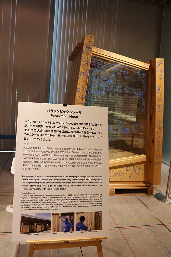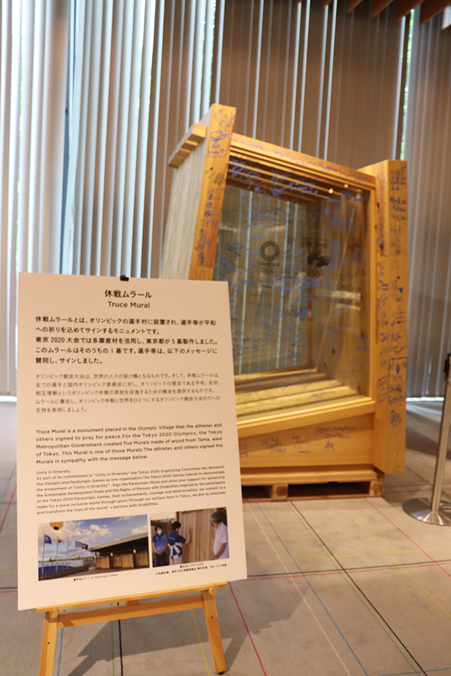 *An Olympic truce mural is a monument that athletes and others can sign with wishes for peace, and a Paralympic Mural is a monument that athletes and others can sign with their hopes for the promotion of the rights of people with disabilities and the realization of a sustainable and harmonious society. Five Olympic Truce Murals and three Paralympic Murals made of wood from Tama, west of Tokyo were created by the TMG and installed in the Olympic and Paralympic Village during the Games. The inauguration ceremonies were held with the Governor of Tokyo, the Presidents of the IOC and IPC, the President of the Tokyo 2020 Organising Committee, and others to send a message of peace from the Village to the world and aim for a peaceful future.