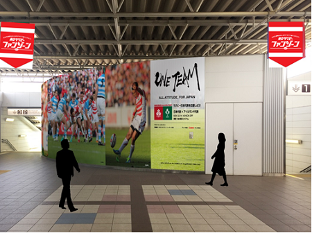 上記PRにあわせて、(公財)日本ラグビーフットボール協会、京王電鉄株式会社及びキヤノン株式会社の協力のもと、京王線飛田給駅コンコース内の壁面にラグビーウォールギャラリーが展開されます。昨年度のテストマッチの興奮がよみがえる大迫力の写真ギャラリーです。