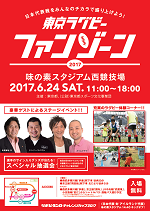 東京都及び(公財)東京都スポーツ文化事業団は、平成29年6月24日(土)に味の素スタジアムで開催される、ラグビーテストマッチ「リポビタンDチャレンジカップ2017日本代表対アイルランド代表」に合わせてラグビーイベント「東京ラグビーファンゾーン2017」を開催します。