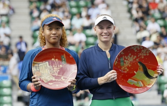 昨年大会シングルス優勝のキャロライン・ウォズニアッキ選手(右)と準優勝の大坂なおみ選手(左)