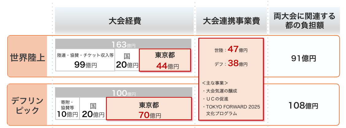 ○現時点における、両大会に関連する東京都の負担額(大会経費における東京都の負担額+大会連携事業費)は、世界陸上が91億円、デフリンピックが108億円となる見込みです。