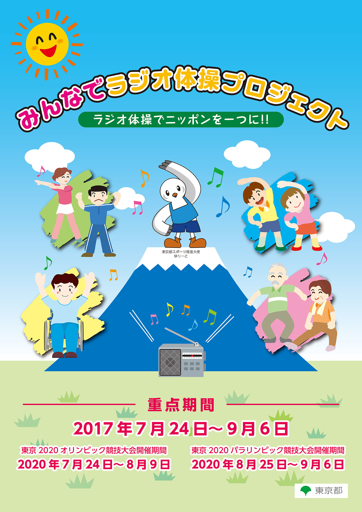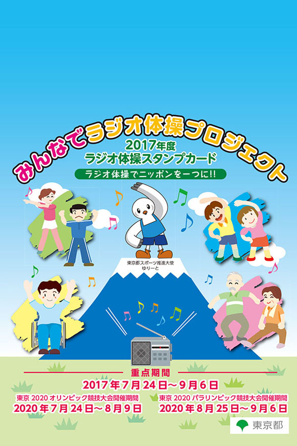 東京都では、東京2020大会への気運醸成と都民の健康増進を目的として、誰もが知っているラジオ体操を活用した「みんなでラジオ体操プロジェクト」を2020年までの間実施します。東京2020大会開催期間にあたる7月24日から9月6日までを重点期間と位置づけ、都内の企業や都民の皆さん、そして広く全国にラジオ体操の実施を推進します。プロジェクト開始日の7月24日にはキックオフイベントを以下のとおり実施します。イベントでは、スポーツの力で東日本大震災の復興を支援し、被災地をつなぐリレー「未来(あした)への道1000km縦断リレー2017」のグランドスタート式と中継をつなぎ、ラジオ体操を行うとともに、会場にエールを送る予定です。